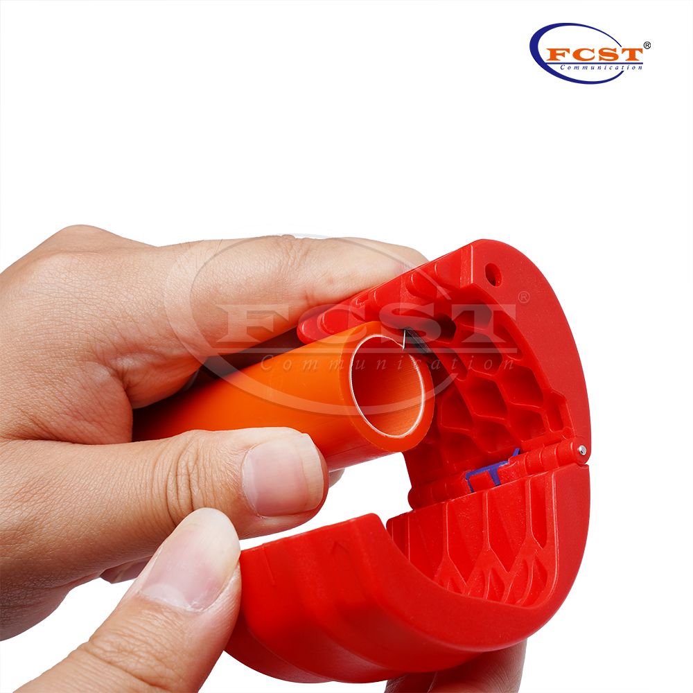 FCST221087 Cortador de tubería inteligente corta la tubería de núcleo de silicio HDPE y el microducción rápidamente, limpiamente y sin dejar escombros. Se adapta cómodamente a la mano y tiene un dispositivo de bloqueo para un transporte seguro. Equipado con un soporte de cuchilla rotativo para las tuberías de corte, con la cuchilla en el medio y la cuchilla para sellarse las mangas en el exterior. Dos cuchillas de repuesto están integradas en la herramienta.
